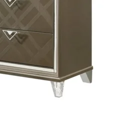The design of this Skylar nightstand brings back a retro look. Different elements like embossed front, metal knob handle, mirrored beveled trim and acrylic legs were utilized to bring the best out of it. 2-storage-drawers allow you to keep your sleeping area nice and neat. This nightstand provides excellent storage to your bedtime essentials. The finely designed feet add a well polished finished as they provide unwavering support to this elegant-piece.