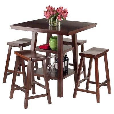 The Orlando 5pc Set High Table, 2 Shelves with Counter Stools Saddle Seat – Walnut – Winsome is a stylish bar table set with both serving space and storage space. The wooden pub table has a stylish high profile and square table top. The table legs support two additional shelves, which are great for storing bottles, glassware or even dishes. This clever table design is a great space saver with a contemporary feel. Four saddle-seat wooden counter stools are the perfect complement to this distinctive piece.