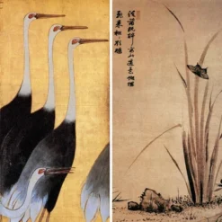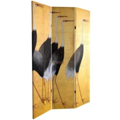 Bring home the mystique of the far east with this versatile room divider from our series of turn of the century, Japanese art reproduction screens. The front is from a silk screen painting, with a small plant being pollinated by a butterfly. On the back is a stylized rendering of tall cranes, originally painted on a gold leaf background. Add a splash of historical Asian artwork to your living room, bedroom, dining room, or kitchen. This three panel screen has different images on each side, as shown.