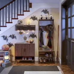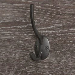 Attractive, metal frame wall shelf features four double coat hooks and one open shelf on top. Use coat hooks for jackets, scarves or handbags and display your favorite decorative items or small storage baskets on the open shelf above. Weathered woodgrain, black metal frames and dark brown coat hooks add simple, contemporary charm to any space. Give your entryway a modern makeover with all four Afton Collection items.