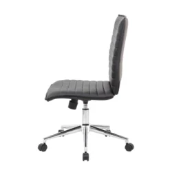 This task chair in black vinyl is designed with a look that brings any room or office to the next level. The chair features a gorgeous and strong chrome 25 inch base with 2 inch nylon dual wheel castors that adds that perfect pop of metallic color to any room. In addition to looking fantastic, the chair also features a spring tilt mechanism, a pneumatic gas lift for easy height adjustability, tilt tension and an upright lock, while also boasting a weight capacity of 275lbs.