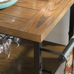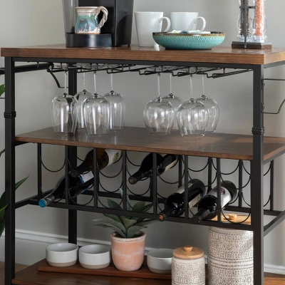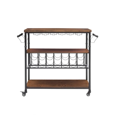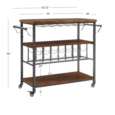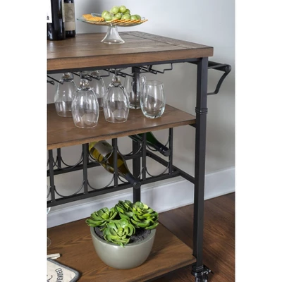 Set the stage for endless cocktail gatherings with the addition of this clever wine cart. Equal parts rustic and industrial, its open design adds a fresh touch to decor while wood planked detailing complements traditional and modern settings. Use the under rack to hang your favorite stemware and grab any wine choice from the spacious dual-level rack. The bottom storage shelf is perfectly sized to keep additional serve ware nearby as you wheel this bar cart throughout the night between rooms. Can accommodate compact microwave ovens.