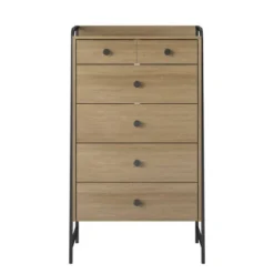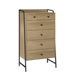 Give your bedroom a fresh makeover with the Bushwick Collection from Novogratz. This rustic Tall 5 Drawer Dresser is comprised of engineered wood with a natural wood grain finish atop an industrial style power coated metal frame. The top drawer is conveniently sized for smaller items, while the roomy lower 4 drawers give enough space to stow away an abundance of clothing, freeing up much needed closet space. Complete the look with the entire Bushwick collection. (each sold separately) The Tall 5 Drawer Dresser ships flat in one box and requires assembly. Two adults are recommended to assemble. Once assembled, the Dresser measures to be 26.4” W x 16.3” D x 46.5” H.