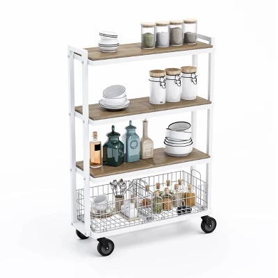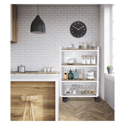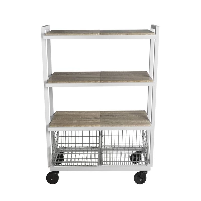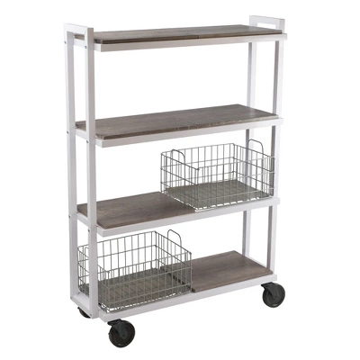 The Transformable 4-Tier Cart System provides efficient mobile storage for use in the kitchen, office or garage. Whether you are entertaining or just need extra storage, you can interchange shelves and baskets to suit your needs. The high quality, powder-coated steel frame is built for years of use. Four casters (two locking) allow for effortless movement. Contains 6 interchangeable laminated shelves and 2 wire baskets with liners. Each shelf allows for 12″ height and a weight capacity of 33 pounds per shelf.