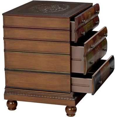 Classic and playful, this fancy traditional 3-drawer end table is deceiving. With a hand-painted chestnut finish with golden accents with embossed book details , this table has a bold design that is sure to stand out wherever it goes.