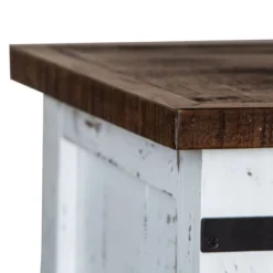 The Picket House Furnishings Darby Wardrobe Chest is designed with charm, individuality, and endless storage capabilities. Crafted in durable solid pine wood, plywood, and MDF. Designed with rustic and industrial detailing to provide character. Finished in white lacquer with distressed mars throughout wood for antique appeal. The top features a brown finish for rustic aesthetic that blends well with a variety of home themes. Features a barn styled door and four open shelves behind the door for storing your favorite clothing or your linens.