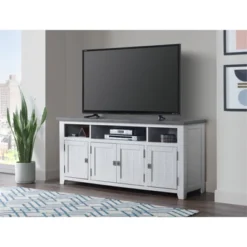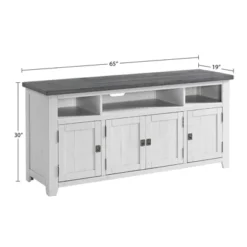 The Foundry TV Stand with its reclaimed lumber look with rough-hewn saw and distress marks fits in perfectly with rustic, farmhouse, and coastal decor. Features the Lightning Fast Assembly System: Easy, quick, and tool less assembly process allows for the TV stand to be assembled in 10 minutes or less. Constructed from solid New Zealand Radiata pine body and mdf back panel. Three (3) large, open component cubbies allow for plenty of space to store TV, video, audio and video game components. A total of four (4) doors give access to three cabinets, one large middle cabinet and two smaller cabinets on each side. Each cabinet features one adjustable and removable shelf along with vertical wire management cutouts. The recessed campaign-style door pulls offer a nice complement to the rustic finish details. Ideal for most 65″ flat panel TVs and up to 70″. Assembly Required.Features : Finish: White Stain with Grey TopConstructed of both solid pine with an MDF back panel for long lasting durabilityThree (3) large, open component cubbies allow for easy access to componentsThree (3) cabinets feature one adjustable and removable shelf along with vertical wire management cut outsAntique Pewter finished recessed campaign-style door pulls complement the White Stain and Grey finishIdeal for most 65″ flat panel TVs and up to 70″Specifications : Product Dimensions : 65″ W x 30″ H x 19″ DSurface Material : PineAssembly details : Adult Assembly Required, No Tools NeededFurniture Subtype : TV StandsNumber of Shelves : 3Number of Doors : 4Assembly Required : Yes, Features the Lightning Fast Assembly System