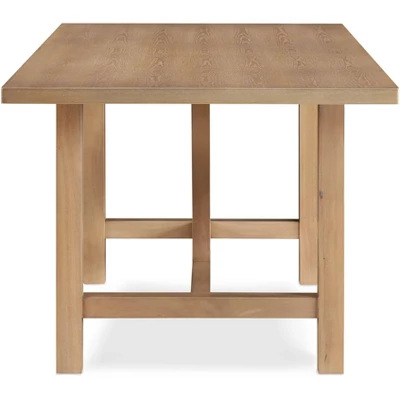 Create a warm, inviting space perfect for any gathering with this timeless wood dining table. This trestle dining table expertly melds elements of modern design with classic farmhouse style. The wood table boasts a rustic, light wood finish that easily matches with the rest of your decor, serving as the centerpiece for holidays and everyday meals alike. At the same time, a modern trestle table base creates an elegant contrast with the timeless rectangular tabletop to elevate this table beyond your everyday dining room design. This modern farmhouse table shows off classic rustic color that creates visual interest thanks to natural wood grains. You can sit up to six comfortably on dining chairs, or add a long bench to seat more people. No matter the occasion, this table serves as the perfect backdrop to memories that will last a lifetime. Comfortable and classic, this table will take your dining room to the next level.