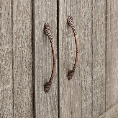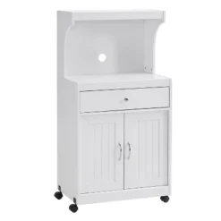 Equipped to provide ample storage and transitional design, the Home Source Charcoal Microwave Cart is the ultimate acquisition for your small kitchen space. The lower one shelf cabinet offers housing for pots, pans, dishes or dry goods while the centrally located drawer accommodates utensils and whatever miscellaneous paraphernalia that always seem to end up in the kitchen!’s counter top affords the ideal location for your microwave while the backdrop’s opening provides easy access to electrical outlets. Top shelf offers handy access to cookbooks and savory ingredients. Constructed on casters, the Home Source Charcoal Microwave Cart is outfitted for total mobility should the need arise.This small kitchen storage wonder is finished in a warm brown cherry laminate and accented with nickel hardware making it the ultimate transitional element in your small kitchen space.