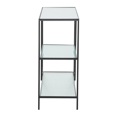 - This industrial console table highlights a obsidian black frame finish with clear ribbed glass tops