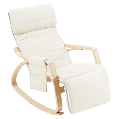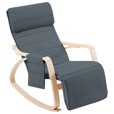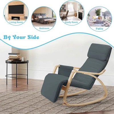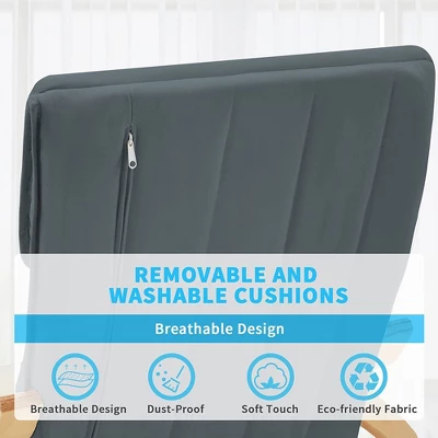 Instantly upgrade any space in your home and enjoy a fun pop of color when you walk around the corner with this Wooden Rocking Chair Armchair with Fabric Padded Seat and Footrest from JOMEED. With a stylish look, this rocking chair adds a contemporary finish to your living room, bedroom, office, and other conversation spaces. Made from high-quality wood with a metal internal frame, this durable chair can hold up to 260 pounds. The surface of these chairs is covered with a soft-sponge cushioned seat and headrest pillow that keep you comfortable for longer. This rocker is designed with an anti-backward seat, arc-shaped base, ergonomic backrest, and armrest designed to fit your body, helping to relieve fatigue and to relax. With a 5-position, manually adjustable footrest, from 90 degrees to 180 degrees, you’ll always be able to find a position to meet your mood, from sitting or reading to laying back for a nap. The included 2-pocket hanging side bag keeps books, magazines, or snacks in arm’s reach. The zippered seat cover is removable and machine-washable, so you won’t have to worry about spills. Easily add character to your favorite indoor spaces with the JOMEED Wooden Rocking Chair Armchair.