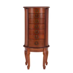Free-standing jewelry armoire in Marquis Cherry finish is accented with classic Louis Philippe features. Flip-top mirror opens to a lined and divided jewelry compartment. Touch latch side doors swing open to reveal necklace hangers. Eight lined drawers for jewelry and accessories. Lining is plush black and drawer pulls are shaped as a shield of honor in antique brass finish. Minimal assembly – only the top needs to be attached. This armoire is easy to maintain, simply spot or wipe clean as needed.