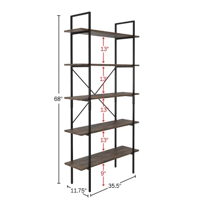 The clean lines of the Industrial Style Bookshelf by Lavish Home provide a stylish yet functional piece for your home or office. This 5-tier shelving unit creates the perfect platform for displaying books, knick-knacks, photo frames, or other home dΓ©cor. This freestanding bookcase is constructed of laminate wood with a faux woodgrain finish and a black steel frame that is sure to turn empty wall space into a focal point that is both attractive and purposeful for years to come.