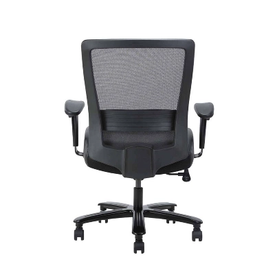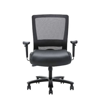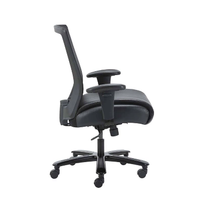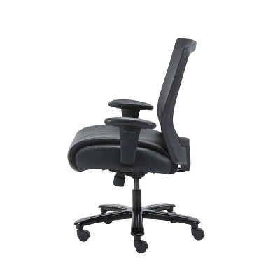 Our heavy duty mesh chair makes the perfect companion to any office, board room, or study. Its 400 pound weight capacity ensures a comfortable sitting experience with a broad range of body types. It’s seat is elegantly upholstered in black LeatherPlus and features a soft pillow top cushions for added comfort. The mesh back allows the cushion to breath with no moisture build up. It has height adjustable arms. The chair features pneumatic gas lift seat height adjustment, a heavy duty spring tilt mechanism, and tilt tension control. All of this sits atop a large 29” steel base with five large heavy duty casters.