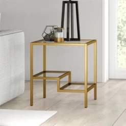 This contemporary side/end table is the perfect addition to your living room or bedroom ensemble. A golden brass metal frame borders the glass table top and two-tiered shelves. Balanced on four legs, the table can hold a weight capacity of 15 LBS.Features : Hand crafted antique brass finish is applied to the steel frame.Clean with a soft, dry cloth; no harsh chemicals or abrasive cleaning materials.Features easy assembly.Weight capacity can support up to 20 LBS.Premium materials have been used in the making of this productSpecifications : Product Weight : 22.9 lbsFrame Material : Metal