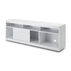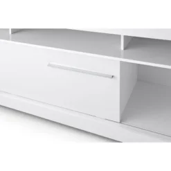 Create a modern, simplistic aesthetic in your living room, lounge, or bedroom with this exquisitely designed TV media entertainment center console. Inspired partially by the new contemporary style, it is subtle in design yet highly tasteful in every way. Boasting a sturdy construction with premium quality composite wood, it comes in a high gloss white finish accompanied by a minimalist, visually appealing design. The five open compartments and a sliding door offer a versatile storage option for all your media necessities, decorative items, living room accessories, or your book collection. The five wire management holes, one in each compartment, offer easy access to wall outlets behind the stand for your electronic devices. Check out our Hud collection for this piece in midnight black finish.