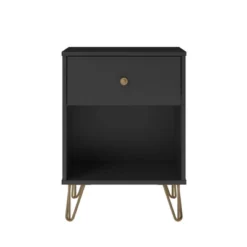 Bring some retro flair to your bedside with the Novogratz Owen Nightstand. The black finish on the laminated particleboard contrasts the gold accents for a fun look for your Nightstand. The drawer and shelf will give you plenty of room for bedside storage. Finish your room with the entire Owen collection for a coordinated look (each sold separately)