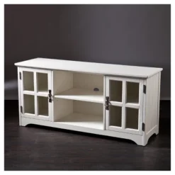 The Remey TV/Media Stand from Aiden Lane lets your family enjoy the latest video games, movies and sports games in style and comfort. This attractive console table with shelves and cabinets keeps your consoles, controllers, DVDs, books and more separated and organized. You’ll never lose another remote or favorite game when you can see them behind the windowpane cabinet or in the open cubbies. This rectangular console table with adjustable shelves fits to your needs and style, so it will grow with you and your family.