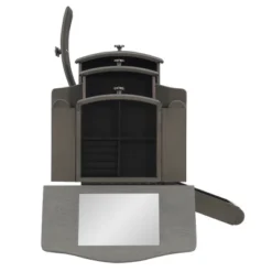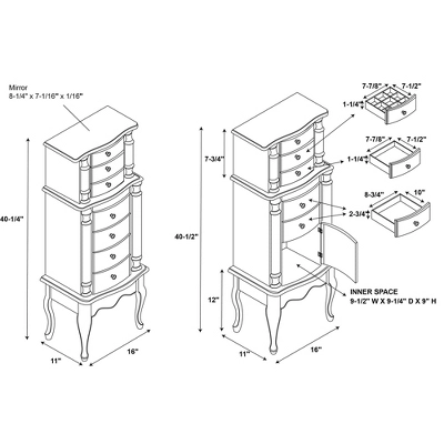 Give your treasured jewelry an extraordinary place to call home with this luxurious armoire. The top lifts open to reveal a mirror that is perfect for applying makeup. Various sized drawers lined in black felt make your jewelry pop and smaller pieces easy to find. Different drawer sections meet your storage demands for all your valuable pieces including bracelets, rings, earrings, necklaces, sunglasses, watches and more. The sides open up to reveal 20 hooks that will keep your necklaces perfectly untangled, and a door opens on the bottom to reveal a generous storage area.