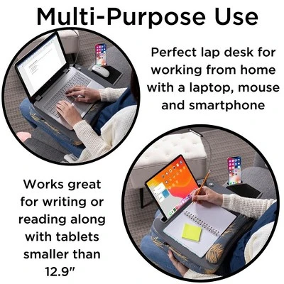 - WORK FROM HOME: the perfect lap desk so you can get work done from the comfort of your bed! The lap desk allows you to use your 13″ or 15″ laptop and a computer mouse with plenty of room to spare. The tablet and smart phone slots allow you to easily see any incoming calls, messages or emails
